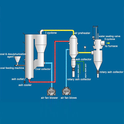 गैसिएटर के नीचे से प्रवेश करने वाले हवा की छोटी मात्रा के साथ पाइरोलिसिस और गैसिएशन प्रतिक्रिया के लिए फीडिंग सिस्टम के माध्यम से कच्चे माल को गैसिएटर में खिलाया जाता है।उत्पन्न ऊर्जा स्थिर प्रतिक्रिया को बनाए रखने में मदद कर सकती है और कच्चे माल को ईंधन गैस और सेमीकोक में बदल सकती हैउत्पन्न ईंधन गैस को अगले चरण में उपयोग के लिए चक्रवात विभाजक के माध्यम से एकत्र किया जाएगा। The large amount of semicoke which is not fully reacted will be carried outside of the gasifier and resent to the gasifier by the return feeder for further reaction after separation through the primary cyclone separatorप्राथमिक चक्रवात विभाजक द्वारा अलग नहीं की गई राख को माध्यमिक चक्रवात विभाजक और बैग फिल्टर द्वारा कैप्चर किया जाएगा और राख निर्वहन प्रणाली के माध्यम से छोड़ दिया जाएगा।ध्वनि गैसीकरण की स्थिति और गैसीफायर के अंदर कच्चे माल के रहने का समय सुनिश्चित किया जा सकता है क्योंकि हमारे पास गैसीफायर व्यास पर एक वैज्ञानिक डिजाइन हैइस प्रकार कच्चे माल को ईंधन गैस में परिवर्तित किया जाता है जिसकी हमें कुशलता से आवश्यकता होती है।